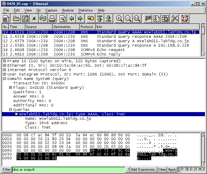 Windows Server 2003をDNSクライアントとして構成すると、IPv6パケットでAAAAレコードに対するnameクエリをDNSサーバーに対して送出する。回答が返ってくる・来ないにかかわらず、次にIPv4パケットでAレコードに対するnameクエリを送出する。この様子はMicrosoft NetworkモニタやEtherealで確認できる。