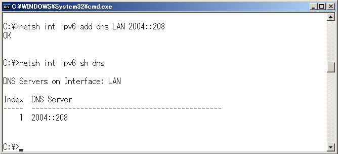 Microsoft TechnetなどではSP1を適用したWindows Xpは、Windows Server 2003相当のnetshの機能となるという記述を見かけるが、 netsh interface ipv6 add dnsコマンドでIPv6のDNSサーバーを指定しても、機能しない。そもそも、Windows XpIPv6でDNSクエリを投げなれないのである。