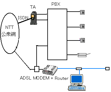 ADSL回線は音声電話との同時使用タイプに変更し、スプリッタによって分けた音声電話回線をPBXの外線として収容する。