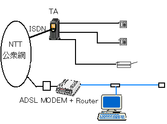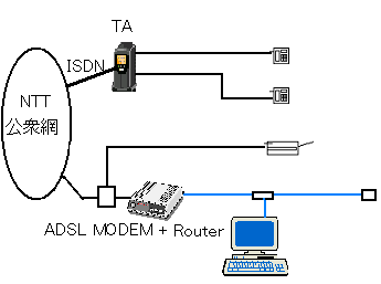 ADSLが1回線引かれ、ルーター経由でPC LANに接続している。