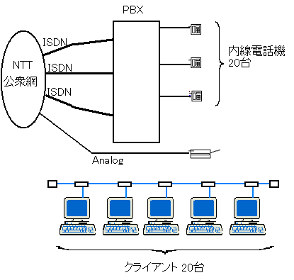 公衆回線や専用線はPBXの外線側ニ収容されており、内線側ニは電話機が接続されている。