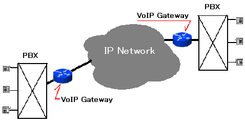 PBXの外線側と内線側それぞれに、Voice Over IP Gatewayが存在している。