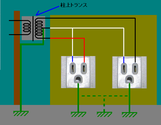 柱上トランスの二次側中点は、大地に接地・・・アース(グラウンド) されている。