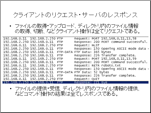 ファイルの提供・受信、ディレクトリ内のファイル情報の提供、などコマンド操作の結果は全てサーバレスポンスとなります。