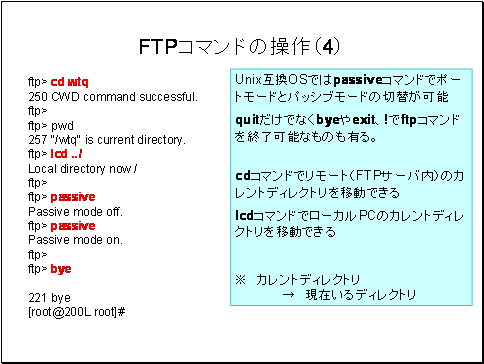Unix互換OSのFTPコマンドではpassiveコマンドでポートモードとパッシブモードの切替が可能です。