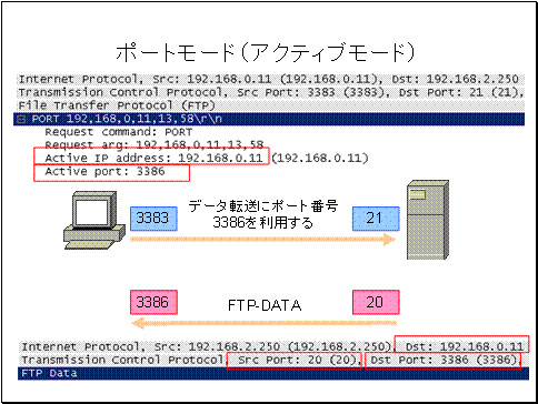 ポートモードは、クライアントがサーバに対して、データ転送に使用するクライアント側のIPアドレスとポート番号をあらかじめ指定してデータ転送します。データ転送に使用するサーバ側のポート番号はTCPポート20番で固定です。