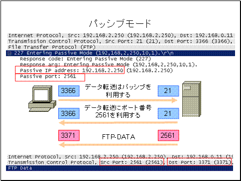 但し、パッシブモードではデータ転送用のポートは20番ではなく、その都度決定します。