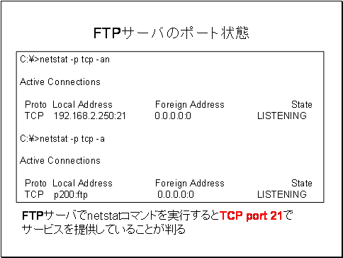 netstatコマンドを利用してFTPサーバのポート状態を見てみましょう。