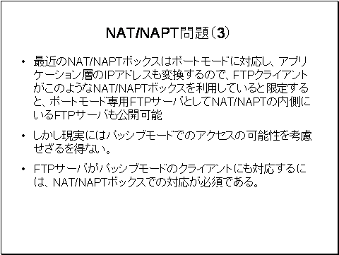最近のNAT/NAPTボックスはポートモードに対応し、アプリケーション層のIPアドレスもグローバルアドレスに変換するので、FTPクライアントがこのようなNAT/NAPTボックスを利用していると限定すれば、ポートモード専用FTPサーバとしてNAT/NAPTの内側にいるFTPサーバもインターネットに公開可能です。