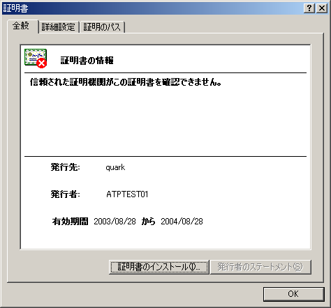 [証明書] ダイアログ ボックスで、[証明書のインストール] をクリックし、証明書のインポート ウィザードを起動します。