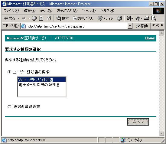 [Web ブラウザ証明書] をクリックして、[次へ] をクリックします。