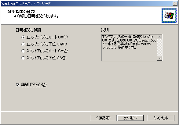 6. 証明機関の種類として[エンタープライズのルートCA]を選択し、[詳細オプション]にチェックを入れます。