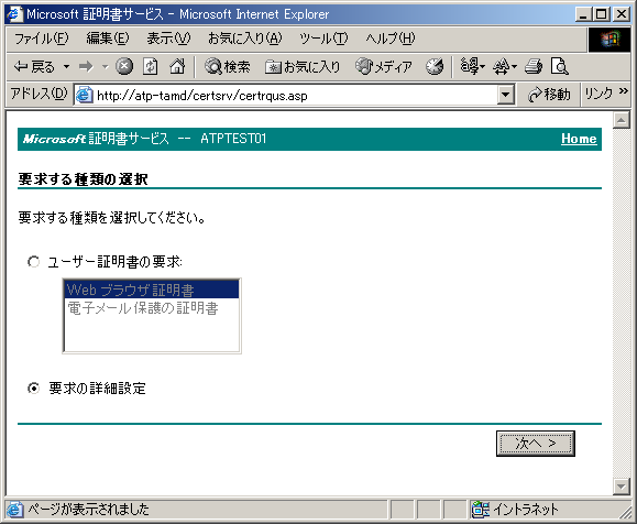 [証明書の要求] をクリックして、[次へ] をクリックします。