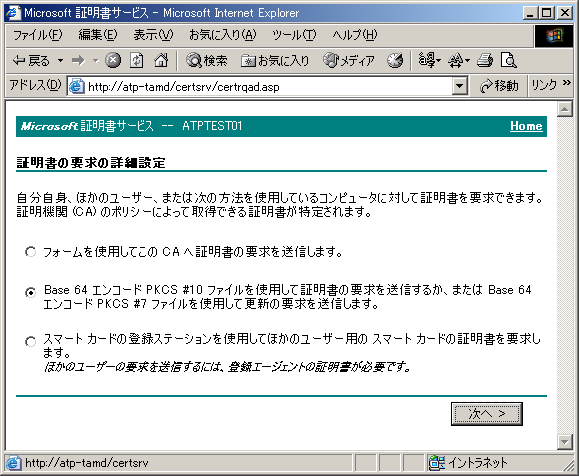[Base 64 エンコード PKCS #10 ファイルを使用して証明書の要求を送信するか、または Base 64 エンコード PKCS #7 ファイルを使用して更新の要求を送信します。] をクリックし、[次へ] をクリックします。
