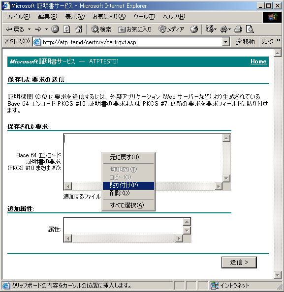[保存した要求の送信] ページに前の手順で作成した証明書要求ファイルの内容を貼り付けます。 次の 2 行の間に表示されたテキストだけを貼り付けます。