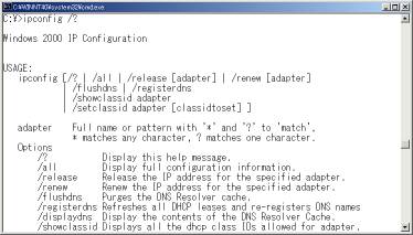 「ipconfig /?」で使用可能なオプションを確認できる。これはOSにより異なる