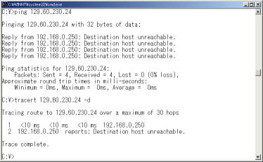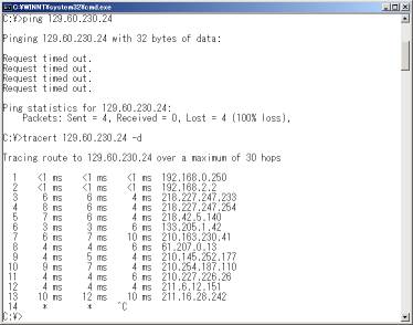 また、リモートネットワークに所属する任意のホストにpingを実行すると、そのネットワークまでのルーティングが成功しているかどうかを判定できるので、リモートホストに障害が発生しているのか、経路上に障害発生かが切り分けできる。応答がない場合、リモートネットワークまでの経路上、どこまで通信が届いているかを確認する(5の「tracert」コマンド参照)。pingでもtracertでも、「Destination