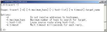 「tracert -?」で使用可能なオプションを確認できるつまり、どのルータまで通信できているのかを確認する。通信できない最初のルータのこちら側に対する経路情報に誤りがあってもreplyは返らない。返す経路がわからないからだ。