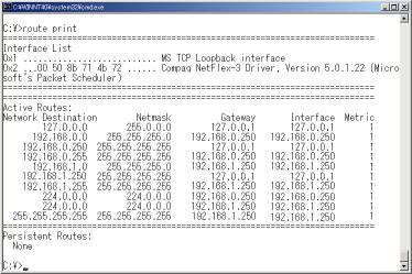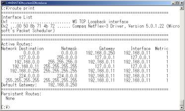 「route print」でWindowsPCの持つ経路情報が表示できる。0.0.0.0のネットワークへのゲートウェイとなっているホストをデフォルトゲートウェイという。