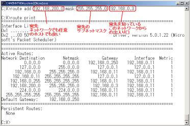 "add"オプションを使用すると経路情報をルーティングテーブルに追加できる。図3のネットワークでPC1に対してPC3のいる192.168.200.0/24のネットワークへ192.168.0.3のホストを経由する経路を設定するには、次のようにコマンドを入力する。