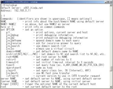 "nslookup"を起動して"/?"を入力すると使用可能なオプションを確認できる。