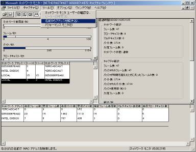 サーバ製品に標準で添付するのネットワークアナライザー。<画面13>SMSに付属のバージョンは「ルータの検索」機能や「名前からアドレス解決する」機能などがあり、サーバ添付の通常バージョンより高機能になっている。このSMS版はクライアント製品にもインストールできる。このネットワークモニタを利用するとネットワーク上のトラフィックをキャプチャして解析ができる。<画面14>フィルタ機能を利用すると任意のプロトコルのトラフィックだけを表示するといったことも可能だ。