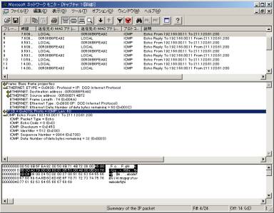 最近は無償のツールであるEtherealが有名だ。ほとんどNetwork monitor と同様の表示が可能となっている。見かけもNetwork monitorそっくりだ。<画面15>しかもNetwork monitorでキャプチャしたファイルをEtherealでも読込み表示が可能である。Windowsネットワークの管理者はこの2つのネットワーワークアナライザーを用意しておけば、どちらかのツールでしか計測・表示できないトラフィックもカバーできる。