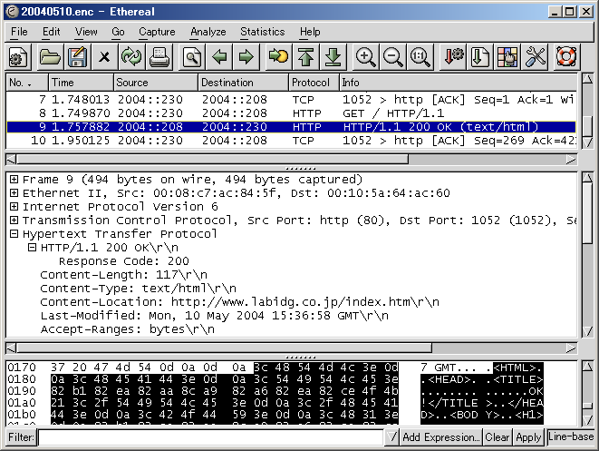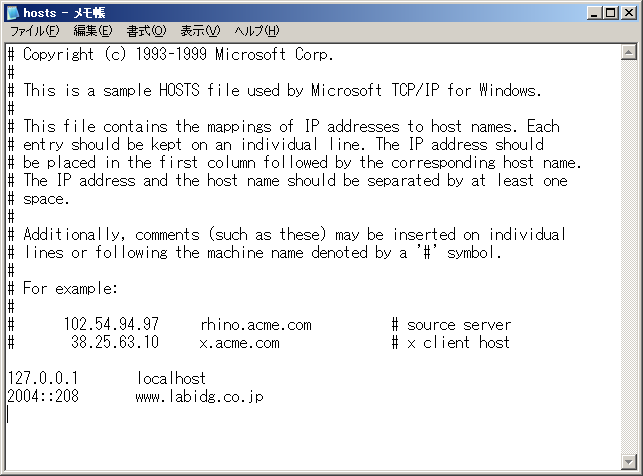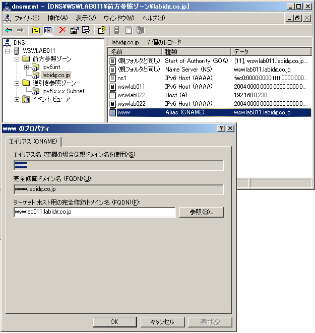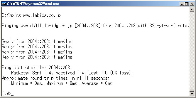 | IPv6でIIS(HTTPサーバ)の構成Internet Information ServerWindows Server 2003でHTTPサーバーを構成するには、さまざまなHTTPサーバーアプリケーションが公開されているが、ここでは標準のIIS(Internet Information Service)を利用する。今回はIISのインストール・設定については触れない。IISのインストール・設定についてはこちらを参照のこと。 IPv6での制限事項MSDNのドキュメントでもWindows server 2003はネイティブにIPv6に対応していると書かれているが、IPv4で使用できる機能すべてがIPv6でも可能ということではない。IPv4では物理サーバー一台に複数IPアドレスを設定して仮想サイトを構築し、複数台のHTTPサーバーとして利用できた。 しかし、残念ながらIPv6では仮想サイトを複数構築しても、IPアドレスがひとつしか与えられない。ひとつのサイトのみをIPv6のHTTPサイトとして公開できる。 アドレス設定IISをIPv6アドレスで利用するに当たって、IPv4と異なるところは一ヶ所、IPv6アドレスで利用するサイトのアドレス設定のみである。IPv4環境でIISを運用する場合、IPアドレスを複数用意することで、一台の物理サーバーで複数のwebサイトが構築できた。FQDNも複数付与可能である。しかし、IPv6ではIPアドレスがひとつしか与えられない。仮想サイトを複数構築しても、そのうちIPv6でアクセス可能なサイトはひとつのみとなる。なぜならば、標準のインターネットインフォメーションサービスマネージャーでは、IPv6のアドレスを任意の仮想webサイトに設定できないからである。IPv6アドレスでアクセスさせたいwebサイトのIPアドレス設定は、(未使用のIPアドレスすべて)という設定にする。   どうやら、明示的にIPv4のアドレスを設定すると、IPv6のアドレスでアクセスできなくなるらしい。DNS(port53)のようにグローバルユニキャストアドレスやリンクローカルアドレスすべてでサービスを提供していれば、きっと複数の仮想サイトが設定できただろう。   これまでの設定でIISをIPv6で公開する準備はできた。IPv4との相違は、アドレスの設定のみである。イントラネット上に既にIPv4で公開しているIISがあれば、必要ならばアドレスの設定を変更するだけで、IPv6対応にできる。 IPv6でのwebブラウズ次にHOSTSファイル、もしくは、DNSサーバーにwebサーバーのエントリを作作り、ホスト名でwebサーバにアクセスできるようにする。HOSTSファイルは、%systemroot%\system32\drivers\etcに存在する。コマンドプロンプトもしくは「ファイル名を指定して実行」から、notepad %systemroot%\system32\drivers\etc\HOSTSで編集可能だ。     pingの実行で名前解決ができているかどうか、確認できる。   ファイル名を指定して実行にhttp://www.labidg.co.jp/と入力して実行する。webブラウザで表示できればOKだ。     Etherealでキャプチャしてみた。IPv6でアクセスしていることがわかる。   つづく・・・・ |