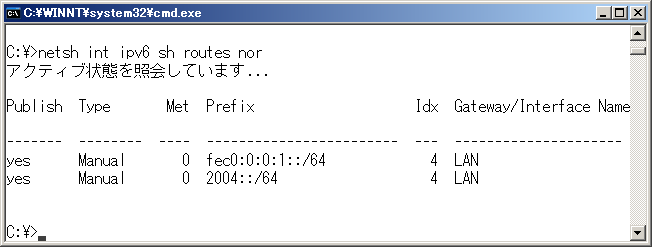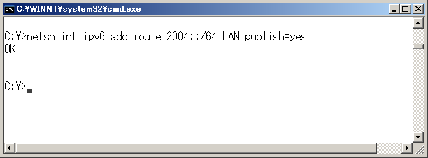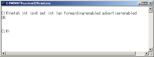 | Windows 2003 をIPv6ルータとして構成する。サーバ用にマニュアルでアドレスを設定したところで、次にIPv6ホストのIPv6ホストの自動アドレス設定を目的としたIPv6ルータを構成する。IPv6ではルータがIPv4のDHCPサーバのごとく、IPv6ホストからの要求に対応してプレフィックスを通知する。この通知をアドバタイズと呼ぶ。IPv6ホストはこのプレフィックスに合わせて重複のないアドレスを自動設定する。 Windows Server 2003でルーティングを有効にするには、netsh interface ipv6 set interface コマンドを使用して、該当するインターフェイス上での転送およびアドバタイズ(広告)を有効にし、その後、netsh interface ipv6 add routes コマンドを使用して、公開するサブネット プレフィックスを設定する。 詳細な例については、Windows Server のヘルプとサポート センターにある「IPv6 インターネットワークの異なるサブネット上のノード間での IPv6 トラフィック」というトピックを参照すること。 IPv6 転送を有効にするにはコマンド プロンプトで アドバタイズを有効にするには[advertise=]enabledとすることでルーター通知メッセージ(RA)を送信出来る。   ※ enabledはenableと過去形でなくても通用するようだ。 ネットワークプレフィックスを割り当てる今回のネットワークプレフィックスは、2004::/64とする。コマンド プロンプトで ※ interfaceはintと省略可能。   ルータというからには複数のNICを実装しているマルチホームコンピュータを想定する。上記と同様のことを別のネットワークインターフェースに対しても適用すると、IPv6ルーターとして構成できる。今回のような、一枚のネットワークインターフェースにのみに適用しても、ローカルネットワーク上のIPv6ホストに対して、ネットワークプレフィックスの払い出しが可能だ。ルーター通知メッセージ(RA)はIPv6ルータから定期的に自動でローカルネットワーク上に送信する。 設定した経路はnetsh int ipv6 show routesで確認できる。   当然だが、このIPv6ルータに、