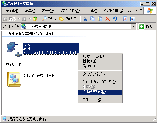 そこで最初から半角英数字のインターフェース名にしてしまえばよい。マイネットワークのプロパティを開き、インターフェースをクリックするか右クリックメニューの「名前の変更」でLANなどの文字に変えてしまおう。