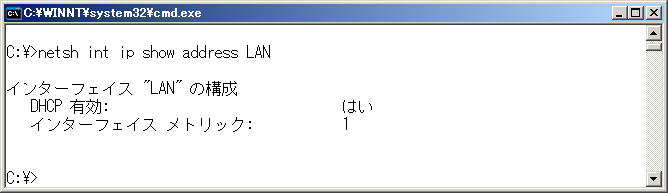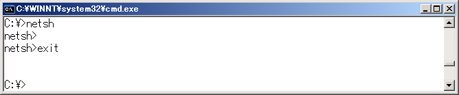 | コマンドプロンプトでnetshとだけ入力してEnterするとnetshのコンテキストモード(Netshellモード) となる。ここでは、netshで用意してあるコンテキストコマンドを利用する。Exitで通常のコマンドプロンプトに復帰する。     netshで用意してあるコンテキストコマンドと引数・パラメータを一行で入力してもできる。この方法を応用すると、バッチプログラムで利用可能だ。netsh /?と入力すると、使用方法が表示できる。   以上の例ではインターフェース名にLANを用いているが、デフォルトのインターフェース名で使用している方はローカル エリア接続などといった2バイトコードの文字や半角空白がインターフェース名に使用されていると思う。これがまことに使用しにくい。コマンドプロンプト内で半角英数字から仮名漢字を入力するモードへの切り替え(MSIMEの起動)が慣れない方もいるだろうし、空白の位置をつかめないと正しく文字入力しているつもりでも失敗する。