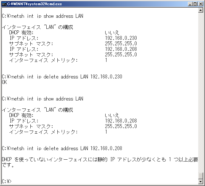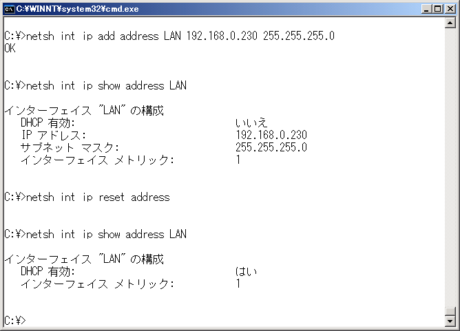 | resetコマンドを使用すると、インターフェースの設定をリセットできる。Windows はデフォルトでDHCPクライアントとして構成されるので、インターフェースをリセットすると、性的に設定されたアドレスは削除され、DHCPクライアントとして構成される。   deleteコマンドで静的に設定してあるアドレスを削除できる。IPアドレスは必ず1つは必要なので、すべてのアドレスの削除はできない。   |