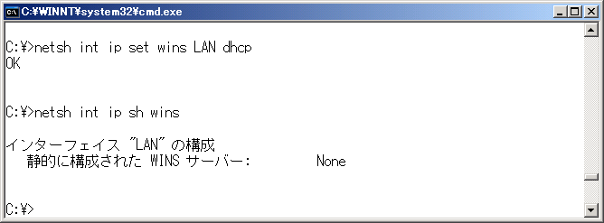 DNSサーバー同様、netsh int ip set wins intfacename dhcpで、インターフェースが参照するWINSサーバーアドレスをDHCPが配布するアドレスに設定できる。