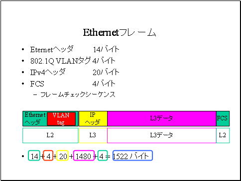 802.1QのVLANタグが付いたイーサネットフレームの最大サイズは1522バイトになります。