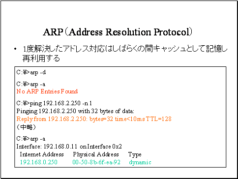 画面例では、arp –dコマンドを複数回実行し、既に持っているARPキャッシュを強制消去し、arp –aコマンドでARPキャッシュの消去を確認しています。これでping実行以前のARPキャッシュエントリは空である事が判ります。