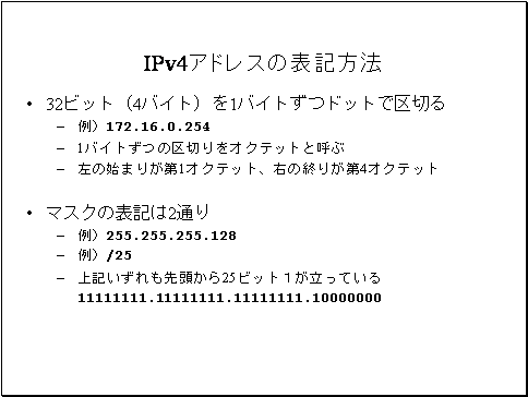 もう一つは /25(スラ25)と、ネットワーク部分を表すビット数で表記する方法です。
