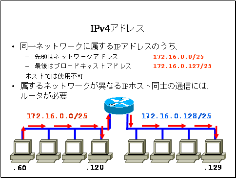 ネットワーク構成を図にして見ました。同一ネットワークに属するIPアドレスのうち、先頭はネットワークアドレスです。最後はブロードキャストアドレスです。この2個のアドレスはホストで使用できません。
