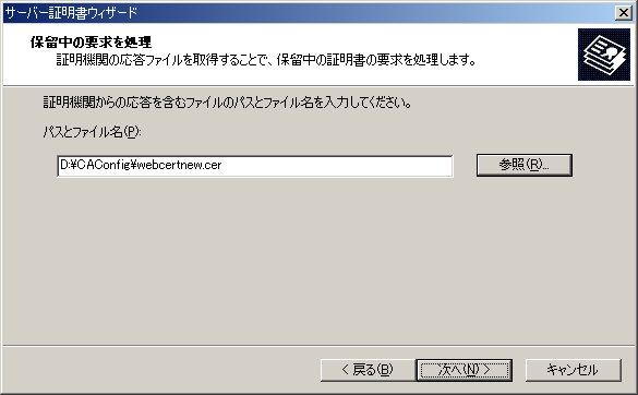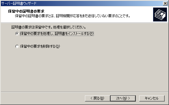 2. [保留中の証明書の確認] をクリックして、[次へ] をクリックします。