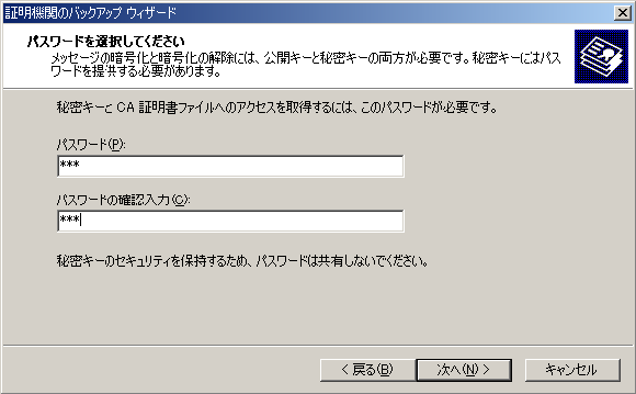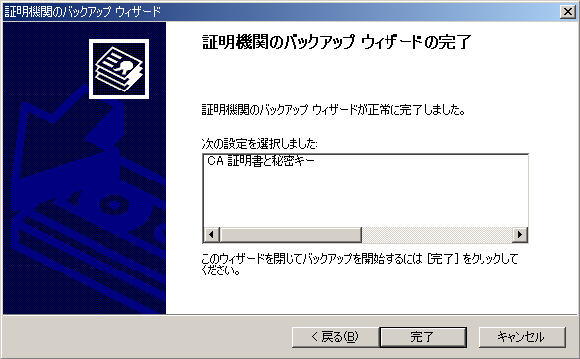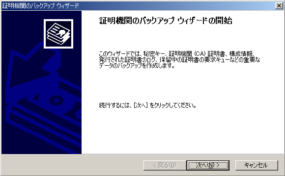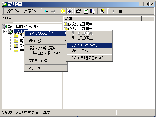 [証明機関 (ローカル)] をダブルクリックし、サーバーを右クリックしメニューから[すべてのタスク]−[CAのバックアップ]を選択します。
