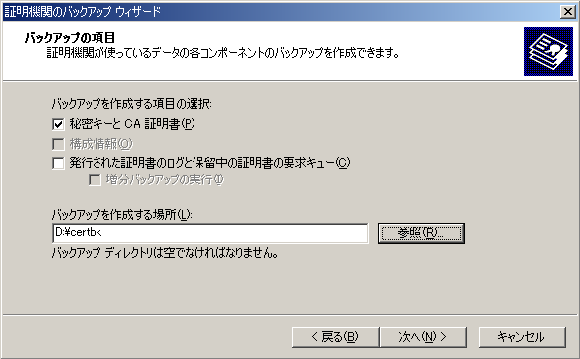 バックアップする項目を選択し、バックアップする場所を指定し、[次へ]をクリックします。