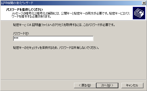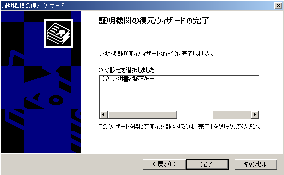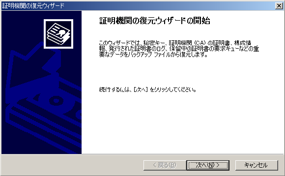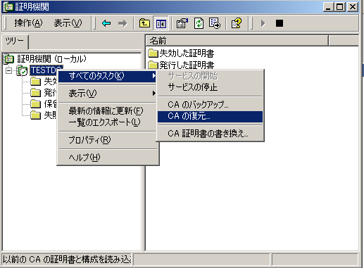 [証明機関 (ローカル)] をダブルクリックし、サーバーを右クリックしメニューから[すべてのタスク]−[CAの復元]を選択します。