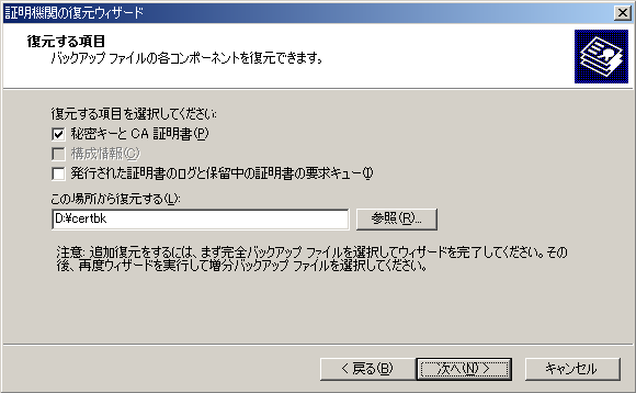 復元する項目を選択し、バックアップを保存してある場所を指定し、[次へ]をクリックします。