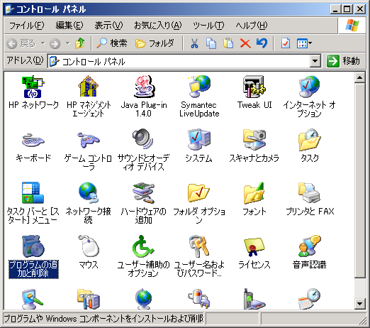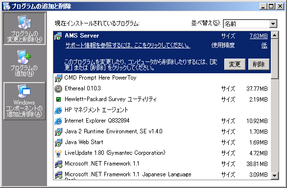 標準サービスのインストールはコントロールパネルのプログラムの追加と削除から行う。