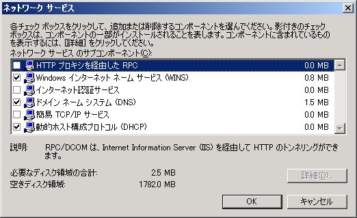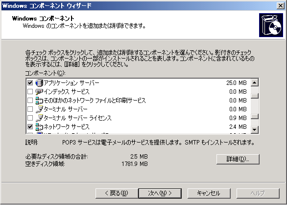 Windows コンポーネントの追加と削除で必要なサービスをインストールする。