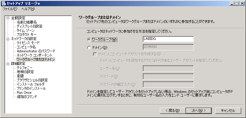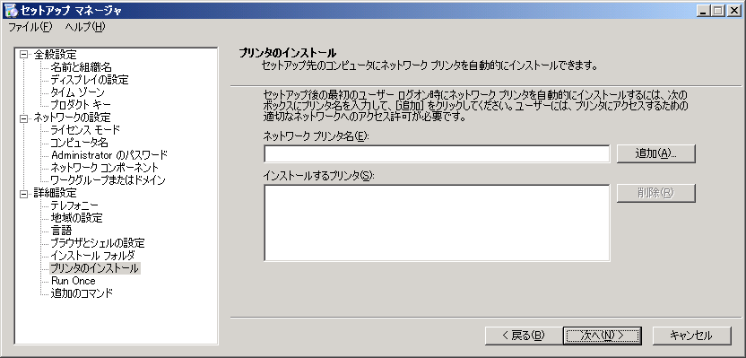 セットアップマネージャーの起動配布共有を新規に作成する場合setupmgr.exeを起動するとウィザードが開始される。次へをクリック。